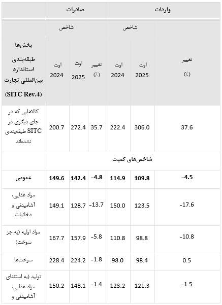 شاخصهای کمی تجارت خارجی تعدیلشده فصلی و تقویمی، اوت  ۲۰۲۵ [۲۰۱۵=۱۰۰]
