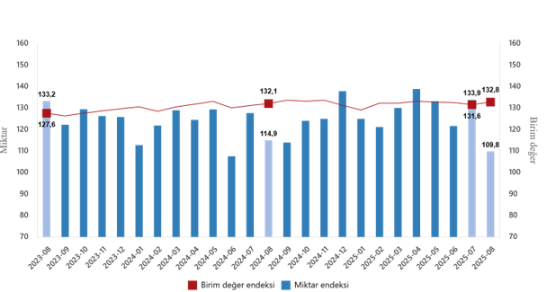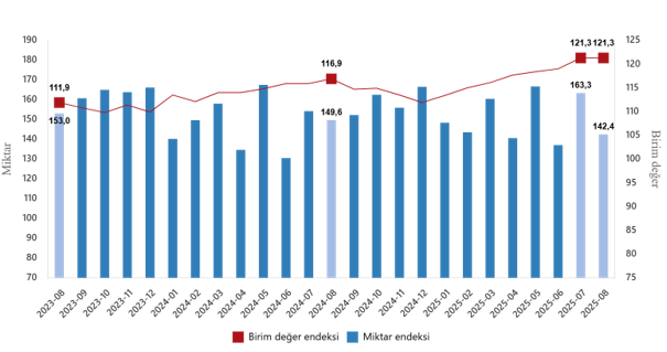طبق سریهای تعدیلشده فصلی و تقویمی، شاخص مقدار صادرات در ژوییه 2025 رقم 157.4 بود، در حالی که در اوت  2025 با 2.8٪ کاهش به 152.9 رسید. طبق سریهای تعدیلشده تقویمی، شاخص مقدار صادرات عبارت بود از : ۱۴۷.۵ در اوت  ۲۰۲۴، در حالی که با ۰.۹٪ کاهش به ۱۴۶.۱ در اوت  ۲۰۲۵ رسید.
