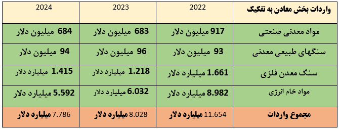 بر اساس اعلام سازمان آمار ترکیه، واردات بخش معدن که سهم ۲.۴۲ درصدی از کل واردات این کشور را تشکیل می‌دهد، در مقایسه با سال ۲۰۲۳ با ۳.۰۲ درصد کاهش به ۷,۷۸۶ میلیارد دلار رسیده است.