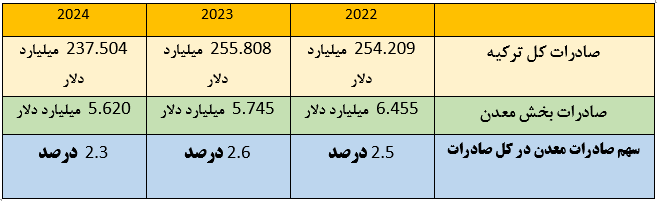 مجموع صادرات ترکیه در سال 2024 بالغ 237.504 میلیارد دلار بوده است که سهم صادرات بخش معدن از کل صادرات این کشور  2.3 درصد  معادل 5.620 میلیارد دلار بوده که نسبت به سال 2023 کاهش داشته است.
