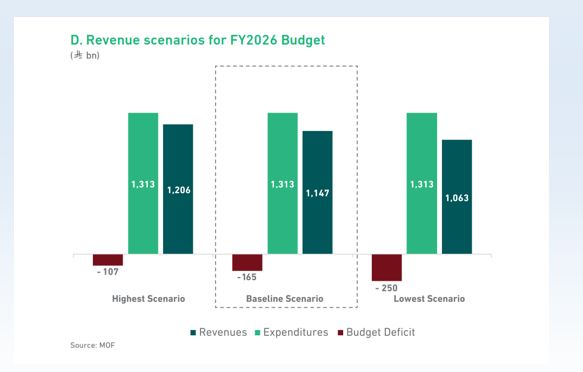 وزارت دارایی برای کسری مالی سال ۲۰۲۶ تخمین می‌زند کسری بودجه از ۲۴۵ میلیارد ریال (۶۵ میلیارد دلار) در سال ۲۰۲۵ که ۵.۳ درصد از تولید ناخالص داخلی بود، به ۱۶۵ میلیارد ریال (۴۴ میلیارد دلار) که ۳.۳ درصد از تولید ناخالص داخلی است، کاهش یابد. این پیش‌بینی بر اساس افزایش ۵.۱ درصدی درآمد و کاهش ۱.۷ درصدی هزینه‌ها نسبت به سال ۲۰۲۵ است. انتظار می‌رود کسری مالی تا سال ۲۰۲۸ به ۱۲۵ میلیارد ریال (۲.۲ درصد از تولید ناخالص داخلی) کاهش یابد.