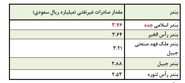 بنادر سعودی در تسهیل صادرات غیرنفتی نقش حیاتی دارند. در اکتبر 2025، بندر اسلامی جده با صادرات به ارزش سه میلیارد و هفتصد و شصت میلیون ریال سعودی در رتبه اول قرار دارد. بعد از آن، بندر رأس الخیر و بندر ملک فهد صنعتی جبیل به ترتیب سه میلیارد و ششصد و چهل میلیون ریال سعودی و سه میلیارد و دویست و ده میلیون ریال سعودی ، صادرات غیرنفتی را پردازش کردهاند. این اطلاعات نشاندهنده نقش استراتژیک بنادر سعودی در رشد تجارت غیرنفتی است و بر اهمیت زیرساختهای حمل و نقل و تسهیل تجارت جهانی در افزایش صادرات غیرنفتی عربستان را تأکید میکند.