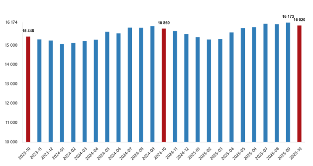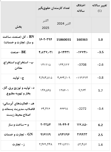 تعداد کل کارمندان حقوق بگیر در بخشهای صنعتی، ساختمانی و خدمات تجاری در اکتبر ۲۰۲۵ در مقایسه با ماه مشابه سال قبل ۱٪ افزایش یافته است. در حالی که تعداد کارمندان حقوق بگیر در ماه مشابه سال قبل ۱۵۸۶۰۰۳۱ نفر بود، در اکتبر ۲۰۲۵ به ۱۶۰۲۰۳۹۴ نفر رسید.