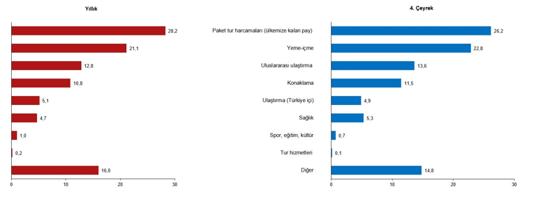 درآمد گردشگری در سه ماهه چهارم (اکتبر، نوامبر و دسامبر) در مقایسه با سه ماهه مشابه سال قبل، 9.9 درصد افزایش یافت و به 15,151,842,000 دلار رسید. درآمد گردشگری از بازدیدکنندگان 14,939,353,000 دلار و درآمد حاصل از مسافران ترانزیت 212,488,000 دلار بود. شهروندان خارجی که از ترکیه بازدید می‌کنند، 19.1 درصد از کل درآمد گردشگری را تشکیل می‌دهند.