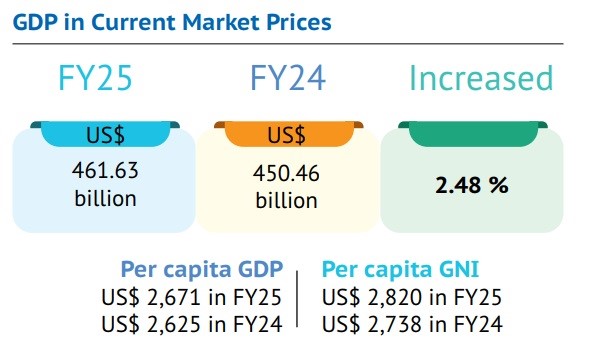 اقتصاد بنگلادش در سال مالی 2024-2025 در شرایطی قرار گرفت که هم زمان نشانههایی از بهبود در بخش خارجی و تداوم ضعفهای ساختاری در بخش داخلی مشاهده میشود. رشد تولید ناخالص داخلی واقعی به حدود 3.97 درصد کاهش یافت که بیانگر افت شتاب رشد اقتصادی نسبت به روند بلند مدت کشور است. در مقابل، عملکرد بخش خارجی به ویژه از محل افزایش صادرات پوشاک و رشد کم سابقه حوالههای ارزی بهبود یافت و موجب تقویت ذخایر ارزی و متعادل شدن حساب جاری شد. تولید ناخالص داخلی اسمیبنگلادش در FY25 به461.63 میلیارد دلار رسید. با جمعیتی در حدود 173 میلیون نفر، درآمد سرانه اسمیکشور 2671 دلار و درآمد ناخالص ملی سرانه 2820 دلار برآورد شد. این ارقام نشان میدهد که بنگلادش به لحاظ سطح درآمد در آستانه تثبیت در گروه اقتصادهای با درآمد متوسط پایین قرار دارد، اما فاصله قابل توجهی با اقتصادهای صنعتی شده آسیایی دارد.