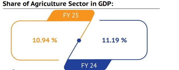 سهم بخش کشاورزی از تولید ناخالص داخلی به 10.94درصد کاهش یافت و نرخ رشد آن به1.79 درصد محدود شد. این کاهش عمدتاً ناشی از افت زیر بخش زراعت و باغبانی است که رشد منفی 0.39 درصدی را تجربه کرد.