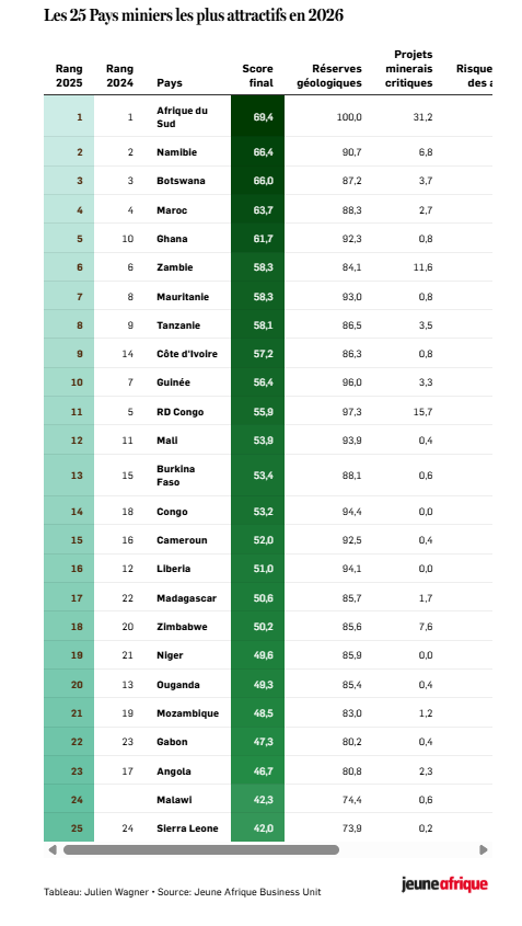 نمونه گروه دولتی مراکشی OCP ثابت می‌کند که این امر امکان‌پذیر است. از طریق آن، این کشور موفق به ساخت زیرساخت‌های باکیفیتی شده است که فسفات‌ها را به کود تبدیل می‌کند. محصولات نهایی به سراسر قاره و سایر نقاط جهان صادر می‌شوند. اما اولویت سرمایه‌گذاران خارجی، بیش از هر چیز، تأمین منابع خود است، زیرا فرآوری اغلب به معنای از دست دادن کنترل بر زنجیره ارزش است. بنابراین چین در طیف وسیعی از مواد معدنی، به ویژه مهم‌ترین آنها، بر این بخش تسلط دارد و از دست دادن سهم بازار استقبال نمی‌کند. این دقیقاً همان نبردی است که جمهوری دموکراتیک کنگو و زامبیا در حال حاضر در بخش باتری در حال انجام آن هستند و به ویژه استدلال می‌کنند که فرآوری محلی می‌تواند از نظر اقتصادی برای اپراتورها سودمند باشد. با صادرات حجم‌های کمتر اما محصولات با ارزش بالاتر، اگر هزینه‌ها کنترل شوند، معادله مطلوب می‌شود.  در همین راستا ژون آفریک فهرستی از کشورهای برتر در حوزه معادن را منتشر نموده است.